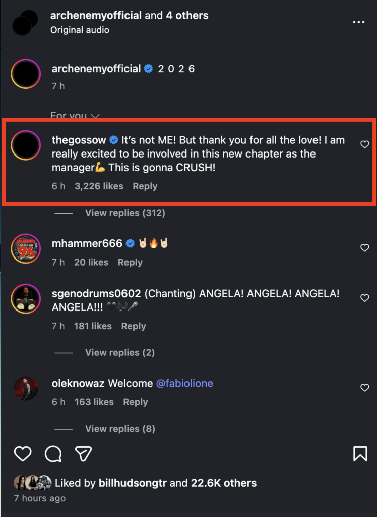 The rumors gained momentum after Arch Enemy posted a teaser video on Instagram on Friday, February 13, featuring a mysterious figure holding a torch and captioned simply “2026.” While the video didn’t name or show any musicians, it tagged three of the four current members of Arch Enemy along with Gossow, who has continued to manage the band since vacating the lead singer position in 2014. Both Arch Enemy and Gossow wiped their social media accounts clean except for the teaser, fueling further speculation about a dramatic return.